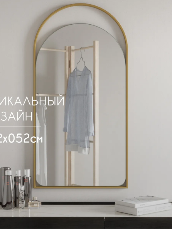 Дизайнерское арочное настенное зеркало Glass Memory Artful в металлической раме золотого цвета в Канске
